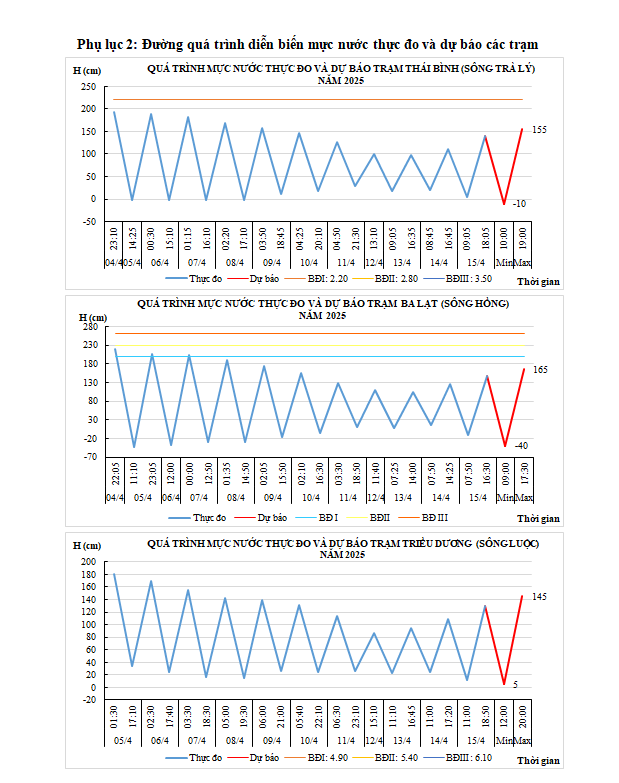 - Mực nước trên các sông Trà Lý, sông Hồng, sông Luộc chịu ảnh hưởng của thủy triều, điều tiết hồ thủy điện: Xu thế lên.