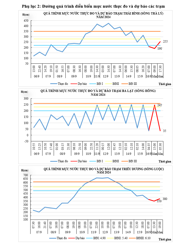 - Khả năng xuất hiện các hiện tượng thủy văn nguy hiểm trong thời hạn dự báo: Mực nước cao nhất ngày 16/9 tại trạm Quyết Chiến, Ba Lạt cao hơn báo động II, trạm Thái Bình, Đông Quý cao hơn báo động I.