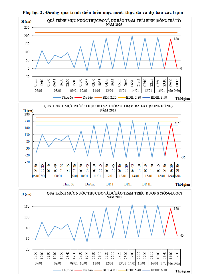 - Mực nước trên các sông Trà Lý, sông Hồng, sông Luộc chịu ảnh hưởng của thủy triều, điều tiết hồ thủy điện: Xu thế xuống.