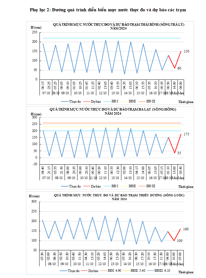 - Mực nước trên các sông Trà Lý, sông Hồng, sông Luộc chịu ảnh hưởng của thủy triều, điều tiết hồ thủy điện: xu thế lên.