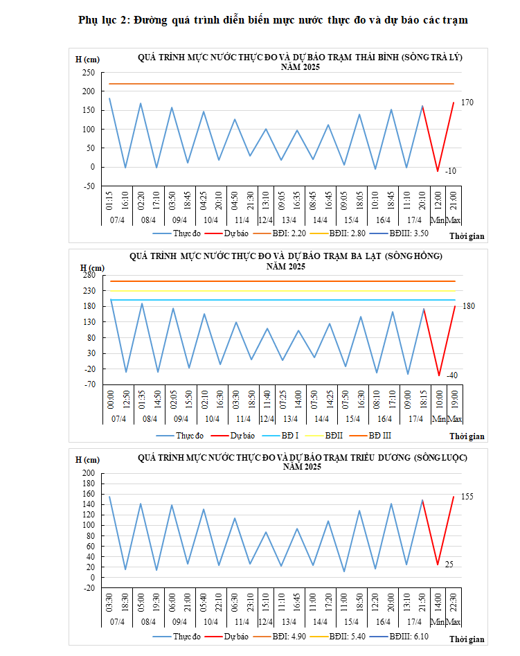 - Mực nước trên các sông Trà Lý, sông Hồng, sông Luộc chịu ảnh hưởng của thủy triều, điều tiết hồ thủy điện: Xu thế lên.