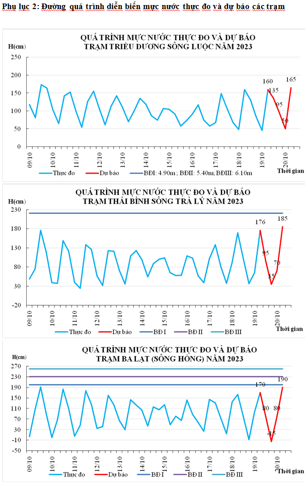 - Mực nước trên các sông Trà Lý, sông Hồng, sông Luộc chịu ảnh hưởng của thủy triều, điều tiết hồ thủy điện: xu thế lên.