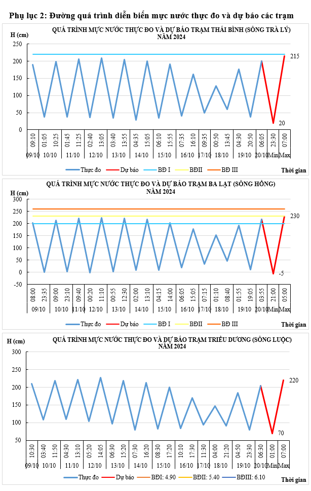 - Mực nước trên các sông Trà Lý, sông Hồng, sông Luộc chịu ảnh hưởng của thủy triều, điều tiết hồ thủy điện: xu thế lên.