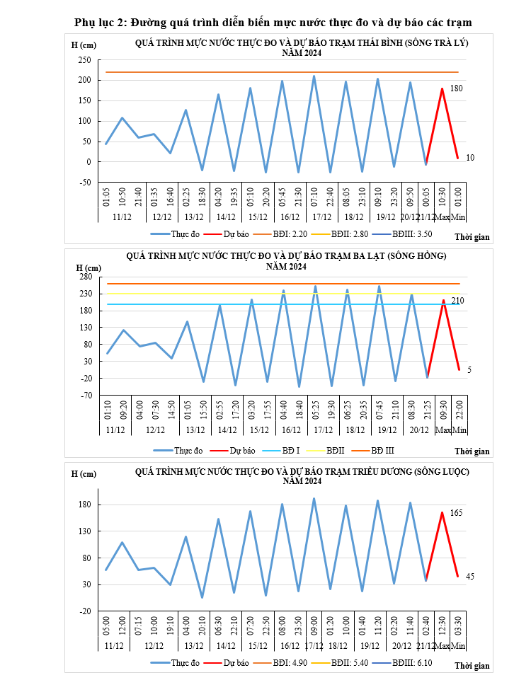- Mực nước trên các sông Trà Lý, sông Hồng, sông Luộc chịu ảnh hưởng của thủy triều, điều tiết hồ thủy điện: xu thế xuống.