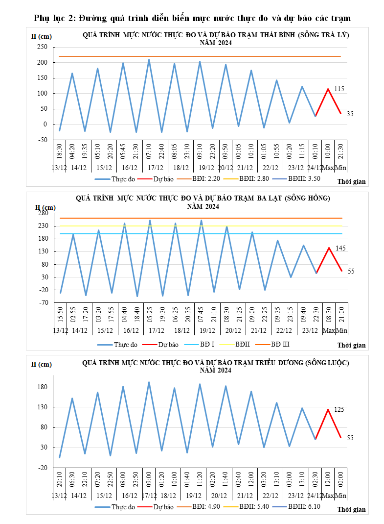 - Mực nước trên các sông Trà Lý, sông Hồng, sông Luộc chịu ảnh hưởng của thủy triều, điều tiết hồ thủy điện: xu thế xuống.