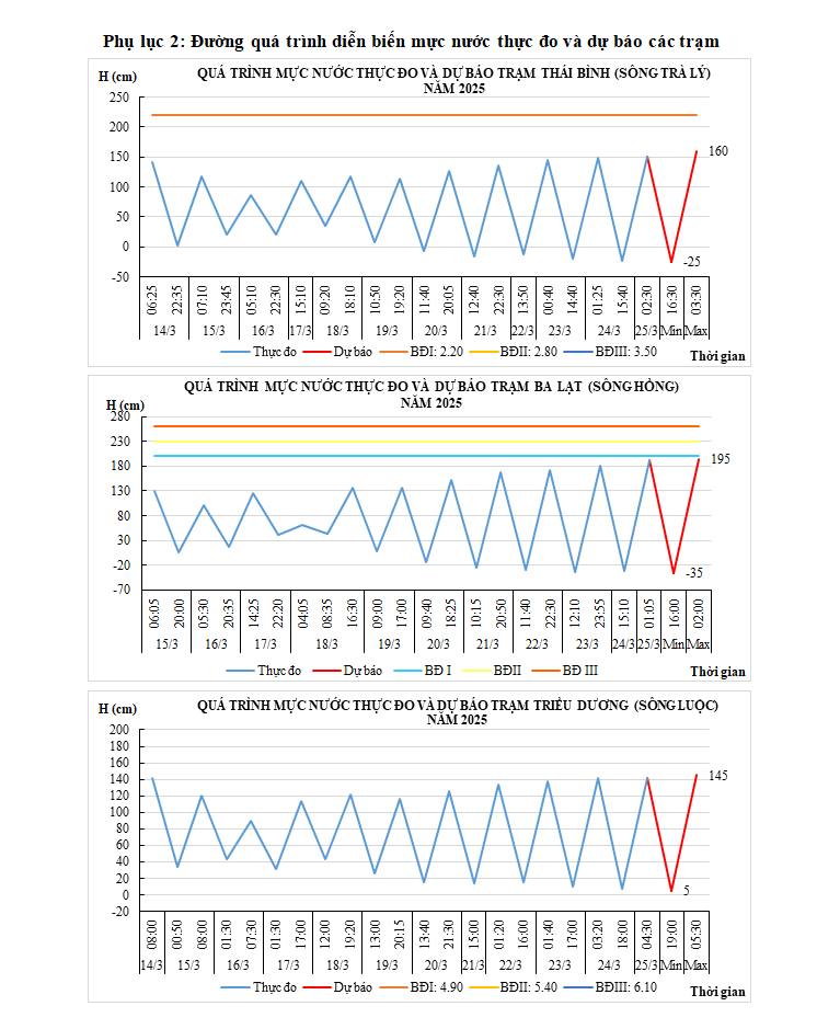 - Mực nước trên các sông Trà Lý, sông Hồng, sông Luộc chịu ảnh hưởng của thủy triều, điều tiết hồ thủy điện: biến đổi chậm.