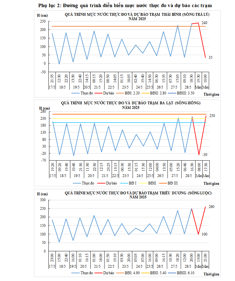 - Khả năng xuất hiện các hiện tượng thủy văn nguy hiểm trong thời hạn dự báo: Đỉnh triều ngày 29/5 tại các trạm Thái Bình, Đông Quý, Ba Lạt có khả năng đạt trên báo động I-II.