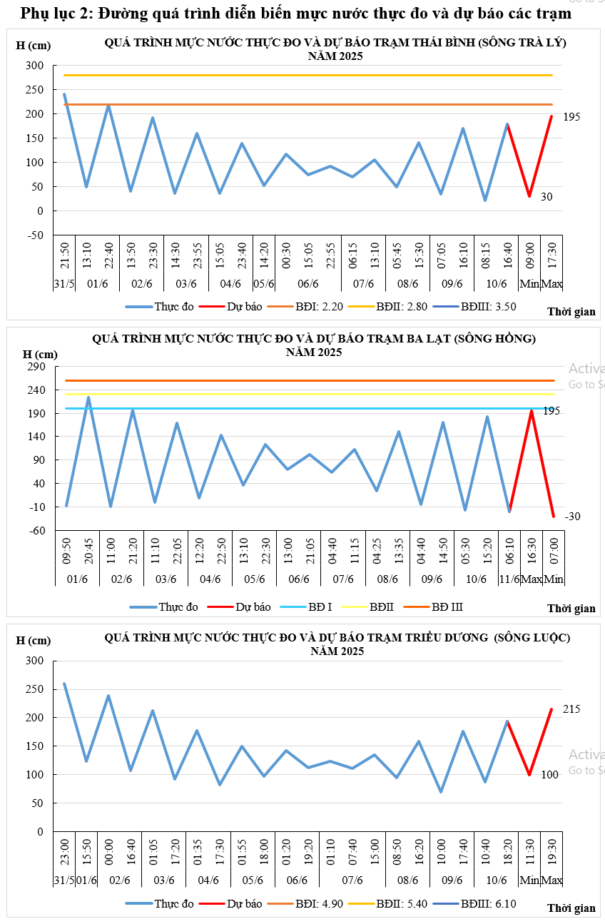- Mực nước trên các sông Trà Lý, sông Hồng, sông Luộc chịu ảnh hưởng của thủy triều, điều tiết hồ thủy điện: xu thế lên.