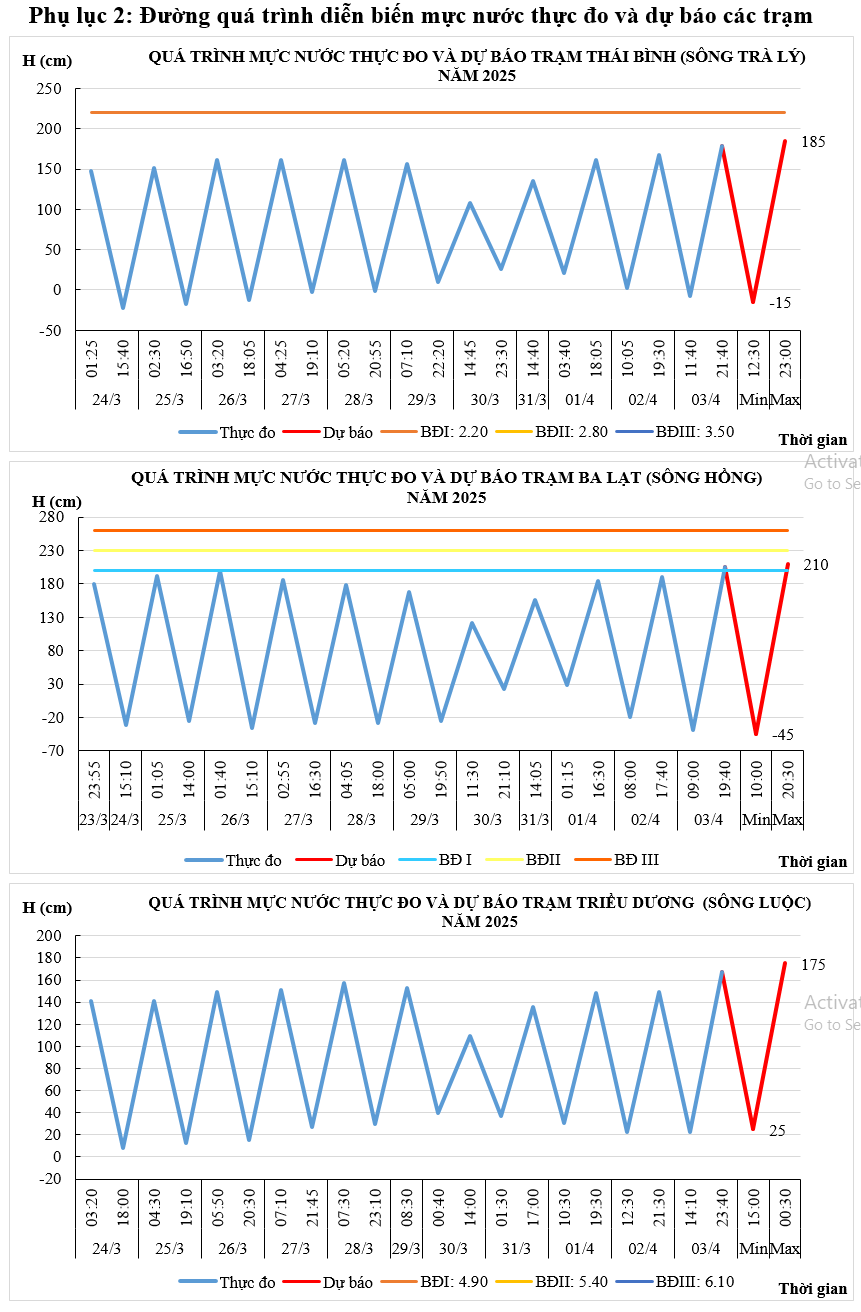 - Mực nước trên các sông Trà Lý, sông Hồng, sông Luộc chịu ảnh hưởng của thủy triều, điều tiết hồ thủy điện: xu thế lên.