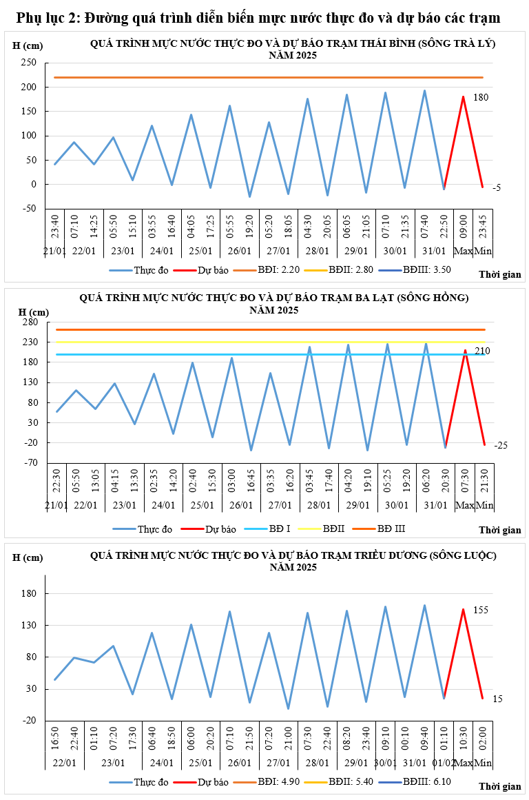 - Khả năng xuất hiện các hiện tượng thủy văn nguy hiểm trong thời hạn dự báo: Ngày 01/02 mực nước đỉnh triều trạm Ba Lạt có khả năng đạt trên báo động I.