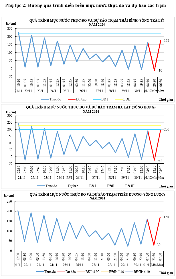 - Mực nước trên các sông Trà Lý, sông Hồng, sông Luộc chịu ảnh hưởng của thủy triều, điều tiết hồ thủy điện: xu thế lên.