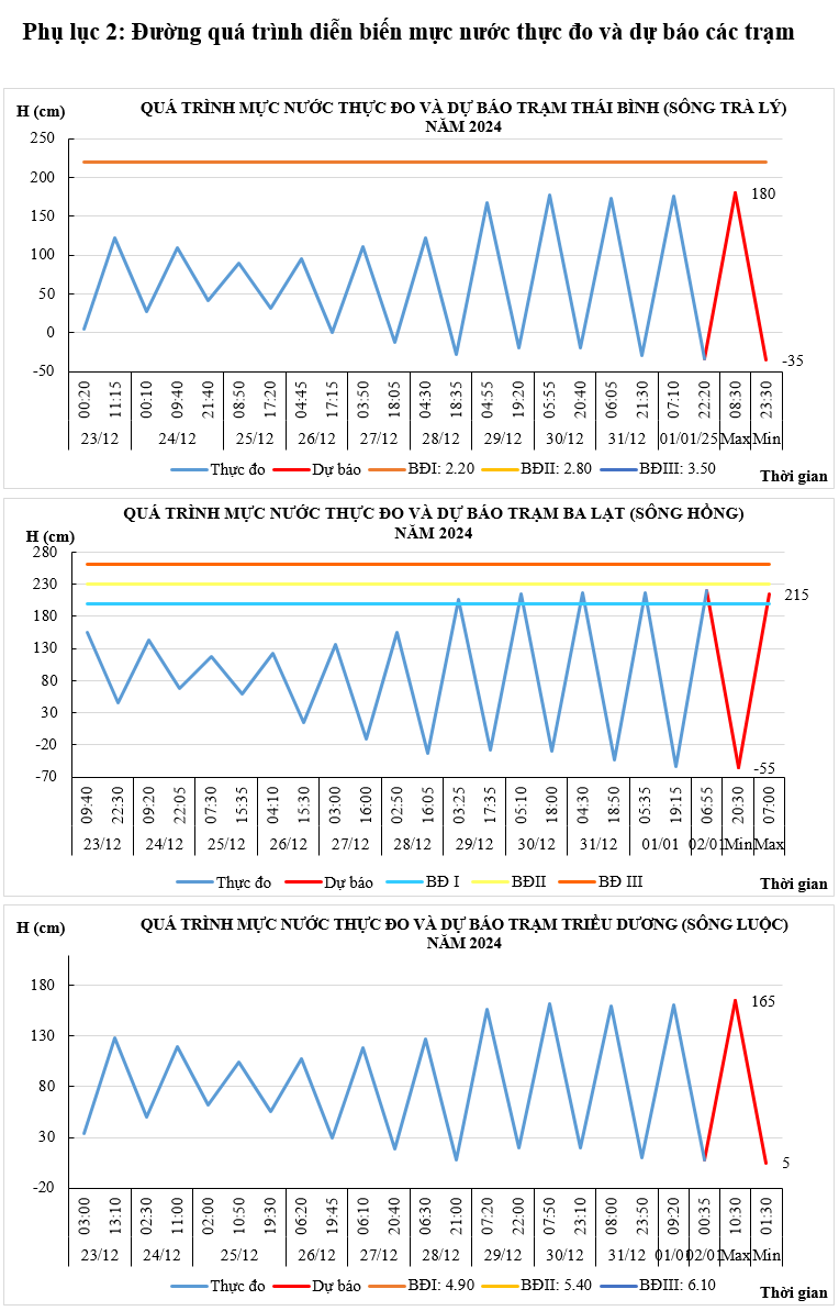 - Khả năng xuất hiện các hiện tượng thủy văn nguy hiểm trong thời hạn dự báo: Ngày 03/01/2025 mực nước đỉnh triều trạm Ba Lạt có khả năng ở mức trên báo động I.