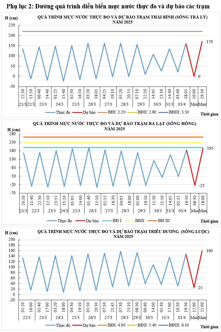 - Mực nước trên các sông Trà Lý, sông Hồng, sông Luộc chịu ảnh hưởng của thủy triều, điều tiết hồ thủy điện: xu thế lên.