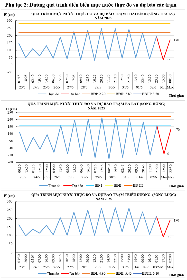 - Mực nước trên các sông Trà Lý, sông Hồng, sông Luộc chịu ảnh hưởng của thủy triều, điều tiết hồ thủy điện: xu thế xuống.