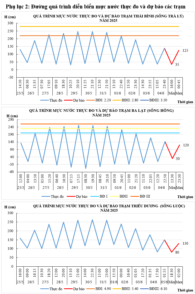 - Mực nước trên các sông Trà Lý, sông Hồng, sông Luộc chịu ảnh hưởng của thủy triều, điều tiết hồ thủy điện: xu thế xuống.