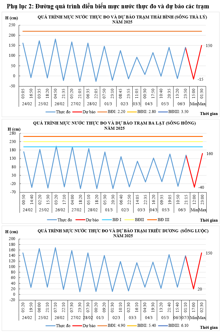 - Mực nước trên các sông Trà Lý, sông Hồng, sông Luộc chịu ảnh hưởng của thủy triều, điều tiết hồ thủy điện: xu thế lên.