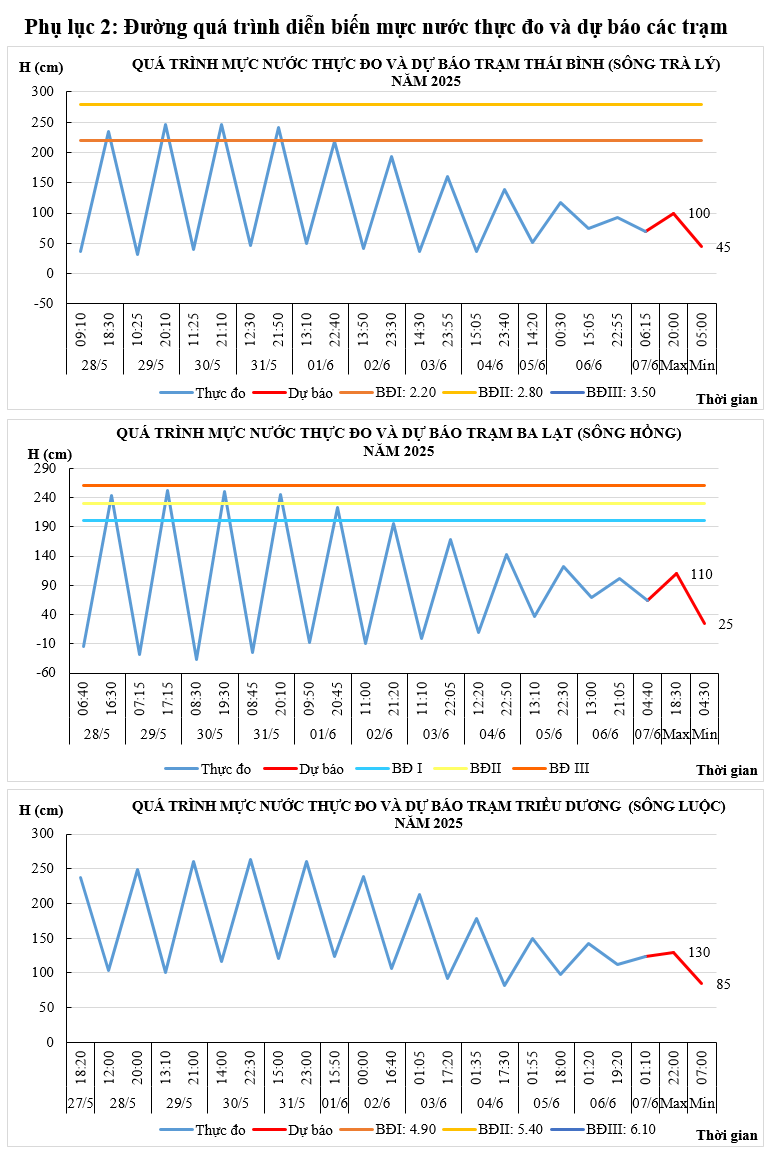 - Mực nước trên các sông Trà Lý, sông Hồng, sông Luộc chịu ảnh hưởng của thủy triều, điều tiết hồ thủy điện: biến đổi chậm.