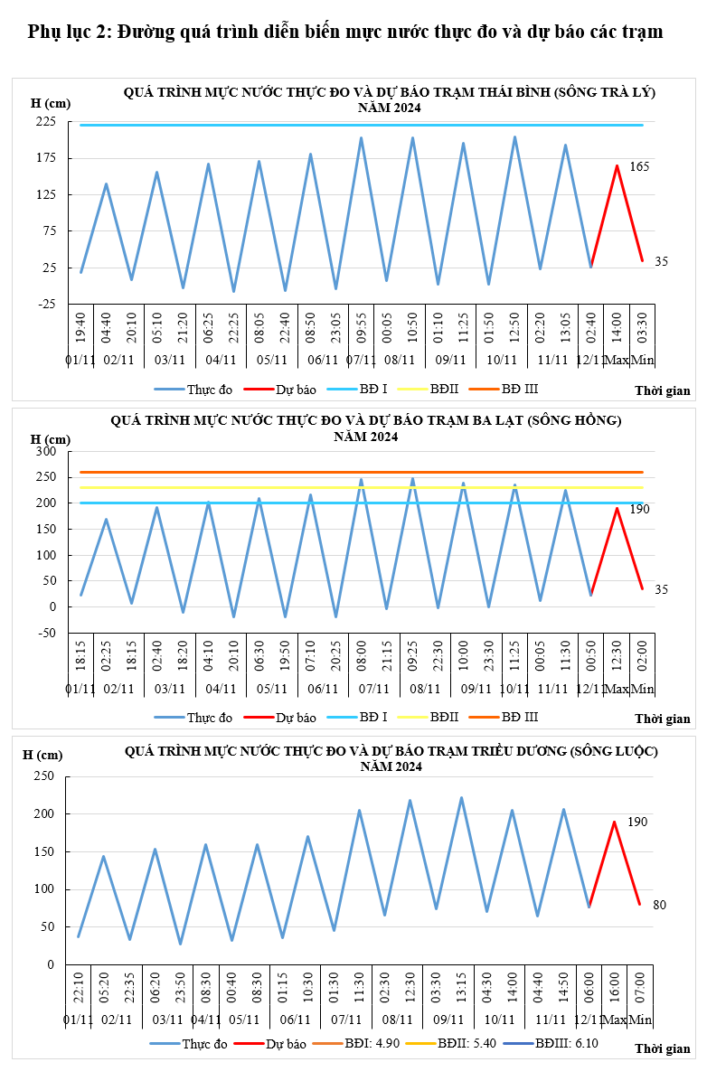 - Mực nước trên các sông Trà Lý, sông Hồng, sông Luộc chịu ảnh hưởng của thủy triều, điều tiết hồ thủy điện: xu thế xuống.