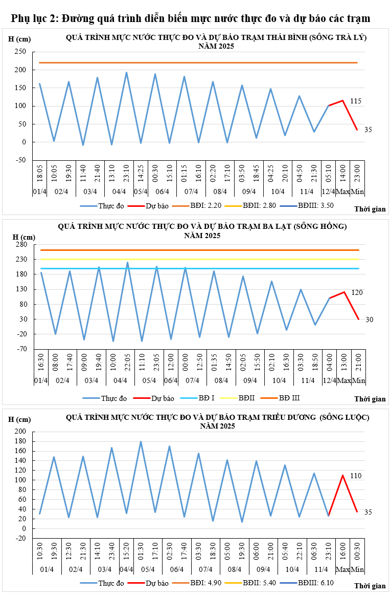- Mực nước trên các sông Trà Lý, sông Hồng, sông Luộc chịu ảnh hưởng của thủy triều, điều tiết hồ thủy điện: biến đổi chậm.