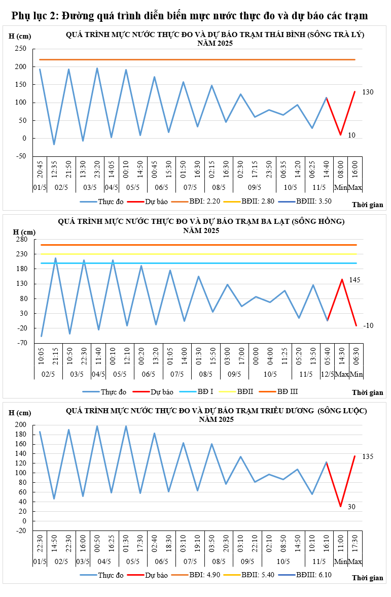 - Mực nước trên các sông Trà Lý, sông Hồng, sông Luộc chịu ảnh hưởng của thủy triều, điều tiết hồ thủy điện: xu thế lên.
