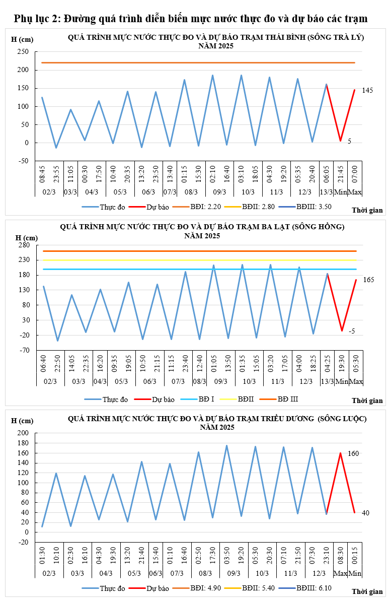 - Mực nước trên các sông Trà Lý, sông Hồng, sông Luộc chịu ảnh hưởng của thủy triều, điều tiết hồ thủy điện: Xu thế xuống.