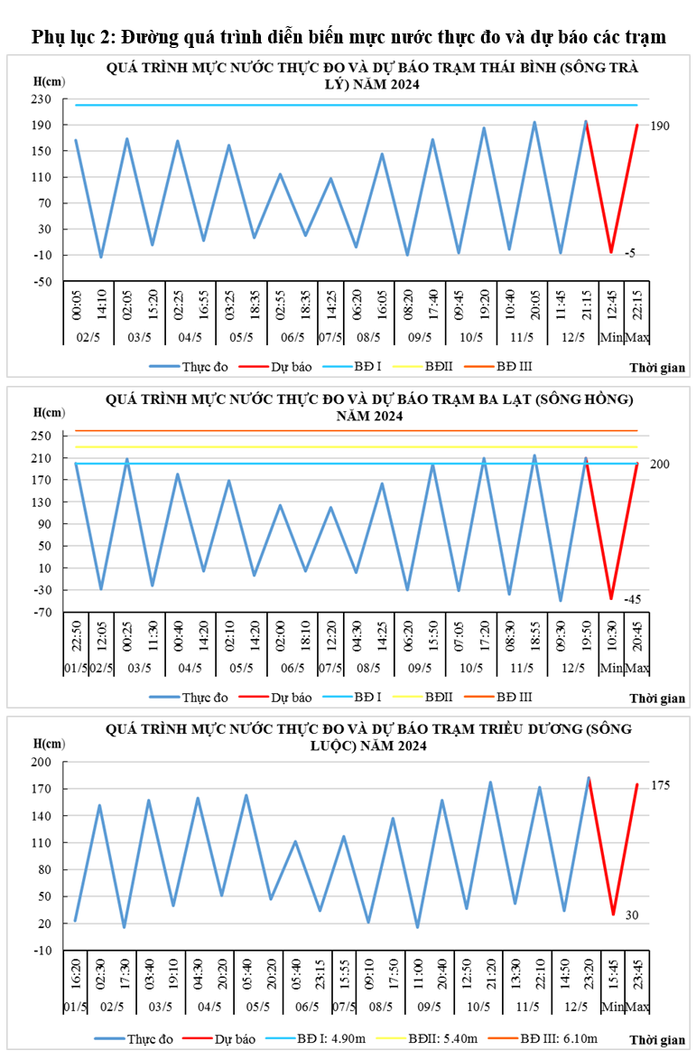 - Mực nước trên các sông Trà Lý, sông Hồng, sông Luộc chịu ảnh hưởng của thủy triều và điều tiết hồ thủy điện: xu thế xuống chậm.