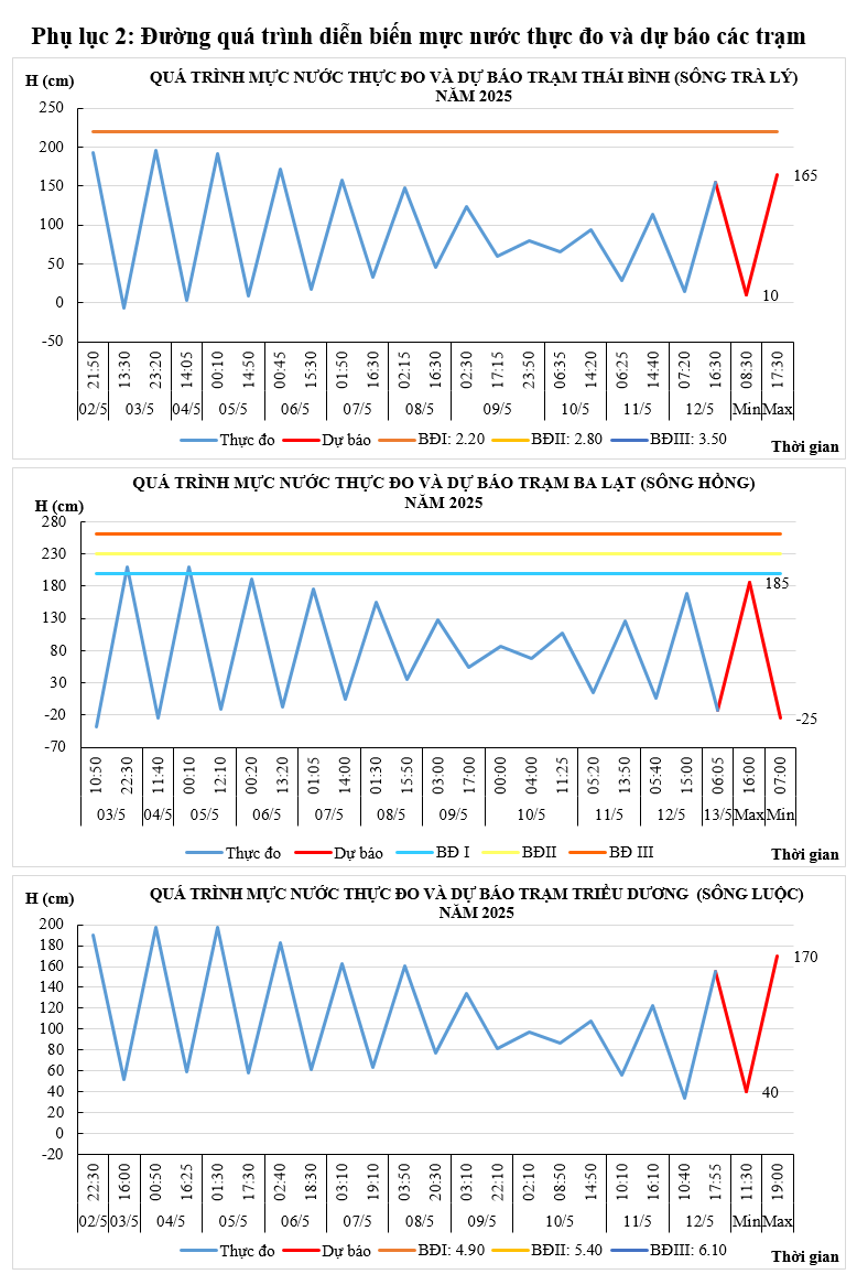 - Mực nước trên các sông Trà Lý, sông Hồng, sông Luộc chịu ảnh hưởng của thủy triều, điều tiết hồ thủy điện: xu thế lên.