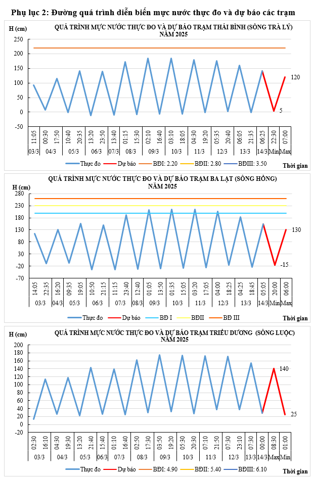 - Mực nước trên các sông Trà Lý, sông Hồng, sông Luộc chịu ảnh hưởng của thủy triều, điều tiết hồ thủy điện: Xu thế xuống.