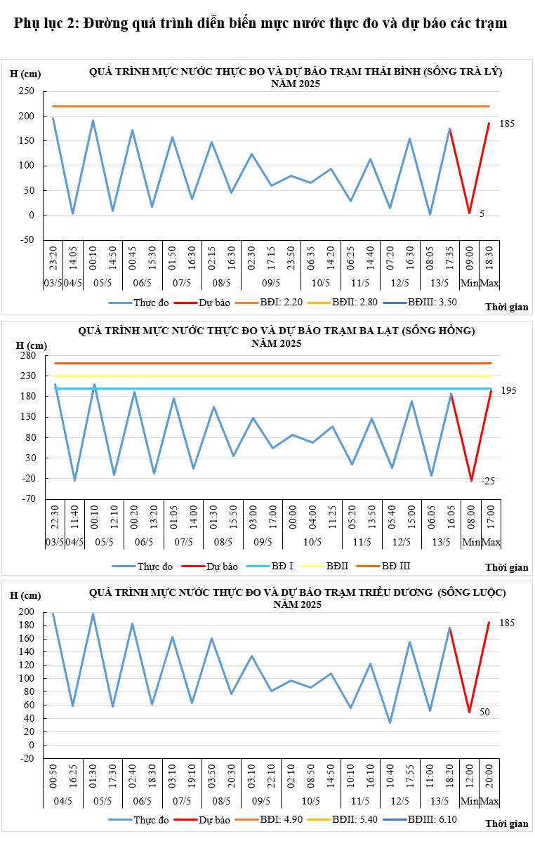 - Mực nước trên các sông Trà Lý, sông Hồng, sông Luộc chịu ảnh hưởng của thủy triều, điều tiết hồ thủy điện: xu thế lên.