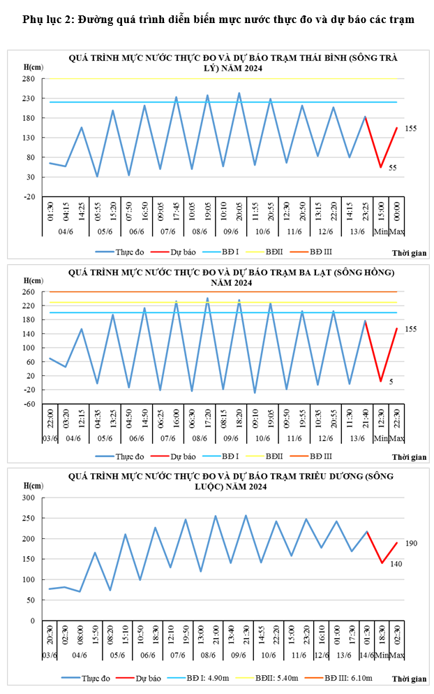 - Mực nước trên các sông Trà Lý, sông Hồng, sông Luộc chịu ảnh hưởng của thủy triều, điều tiết hồ thủy điện: xu thế xuống.