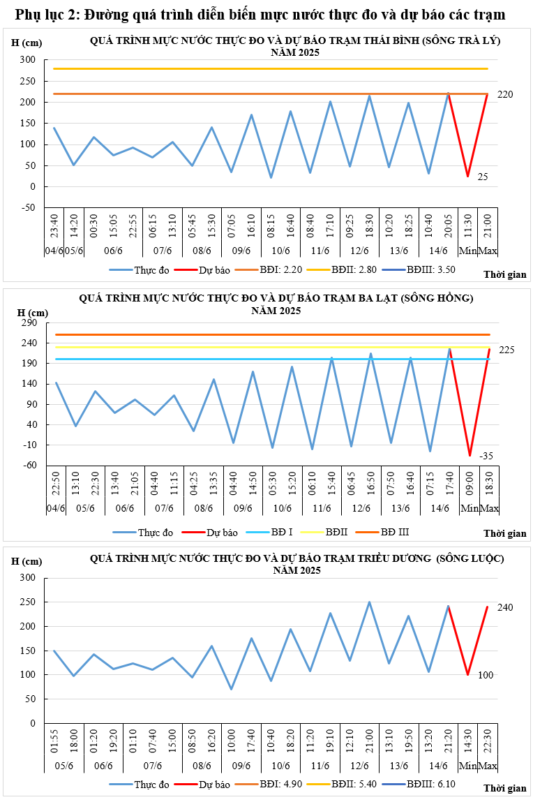 - Mực nước trên các sông Trà Lý, sông Hồng, sông Luộc chịu ảnh hưởng của thủy triều, điều tiết hồ thủy điện: Biến đổi chậm.