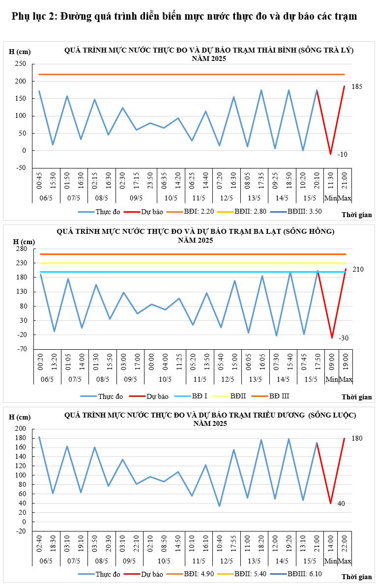 - Khả năng xuất hiện các hiện tượng thủy văn nguy hiểm trong thời hạn dự báo: Đỉnh triều ngày 16/5 tại trạm Ba Lạt có khả năng đạt trên báo động I.