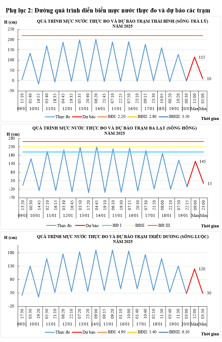 - Mực nước trên các sông Trà Lý, sông Hồng, sông Luộc chịu ảnh hưởng của thủy triều, điều tiết hồ thủy điện: Xu thế xuống.