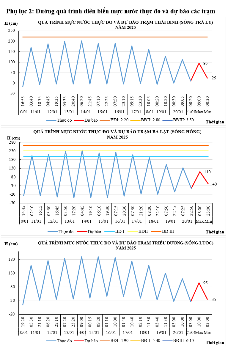 - Mực nước trên các sông Trà Lý, sông Hồng, sông Luộc chịu ảnh hưởng của thủy triều, điều tiết hồ thủy điện: Xu thế xuống.