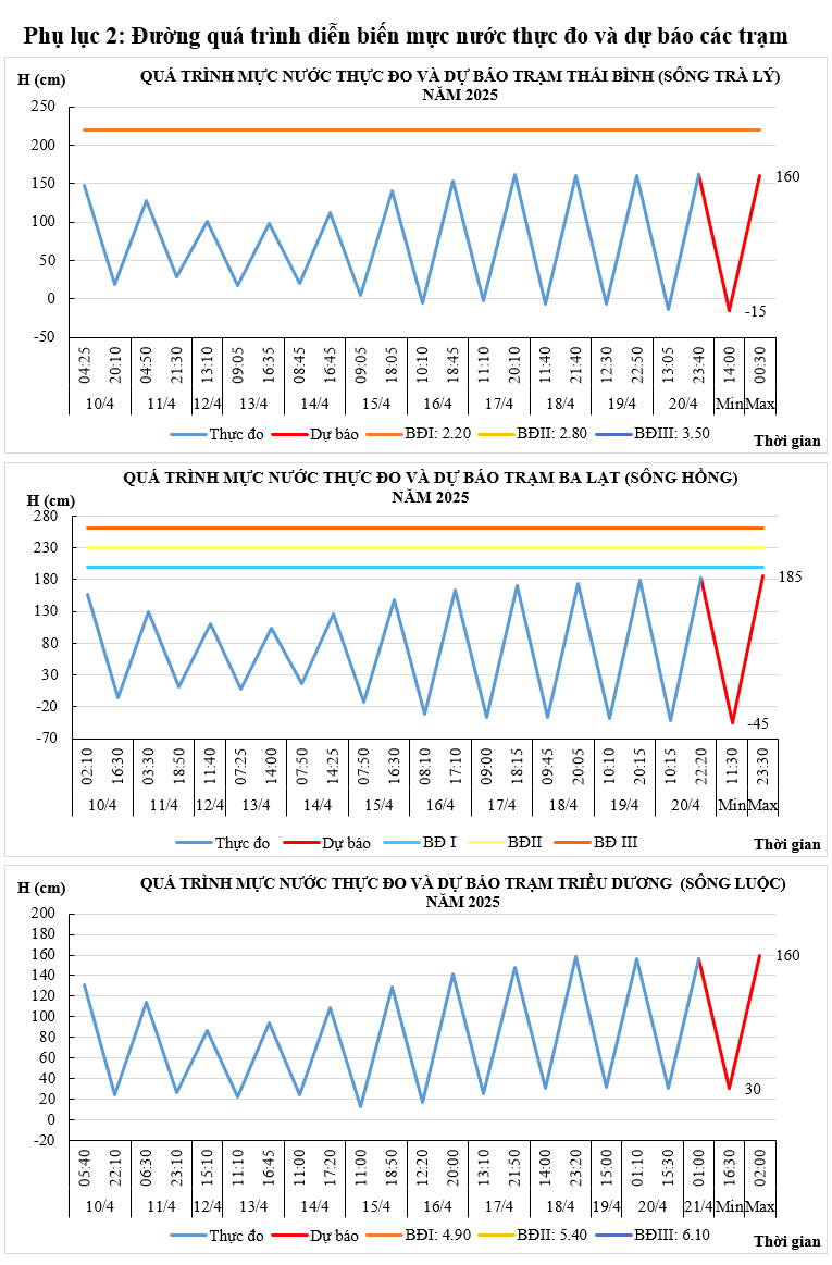 - Mực nước trên các sông Trà Lý, sông Hồng, sông Luộc chịu ảnh hưởng của thủy triều, điều tiết hồ thủy điện: xu thế lên chậm.