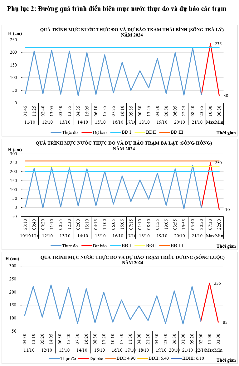 - Khả năng xuất hiện các hiện tượng thủy văn nguy hiểm trong thời hạn dự báo: Ngày 23-25/10 mực nước đỉnh triều trạm Thái Bình, Đông Quý, Ba Lạt có khả năng trên mức báo động I-II.