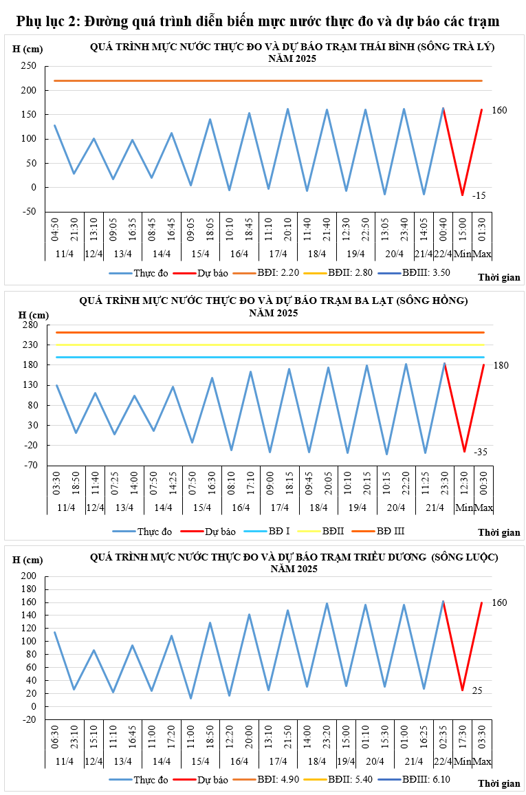 - Mực nước trên các sông Trà Lý, sông Hồng, sông Luộc chịu ảnh hưởng của thủy triều, điều tiết hồ thủy điện: biến đổi chậm.