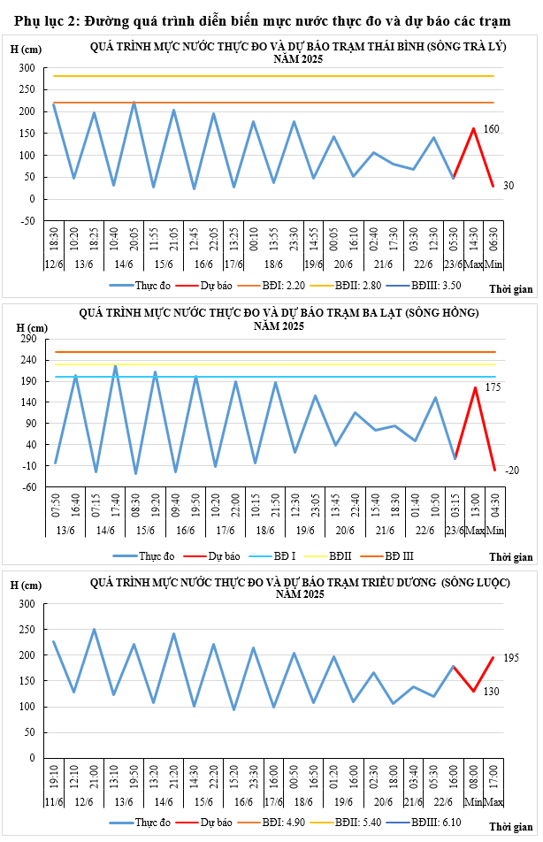 - Mực nước trên các sông Trà Lý, sông Hồng, sông Luộc chịu ảnh hưởng của thủy triều, điều tiết hồ thủy điện: xu thế lên.