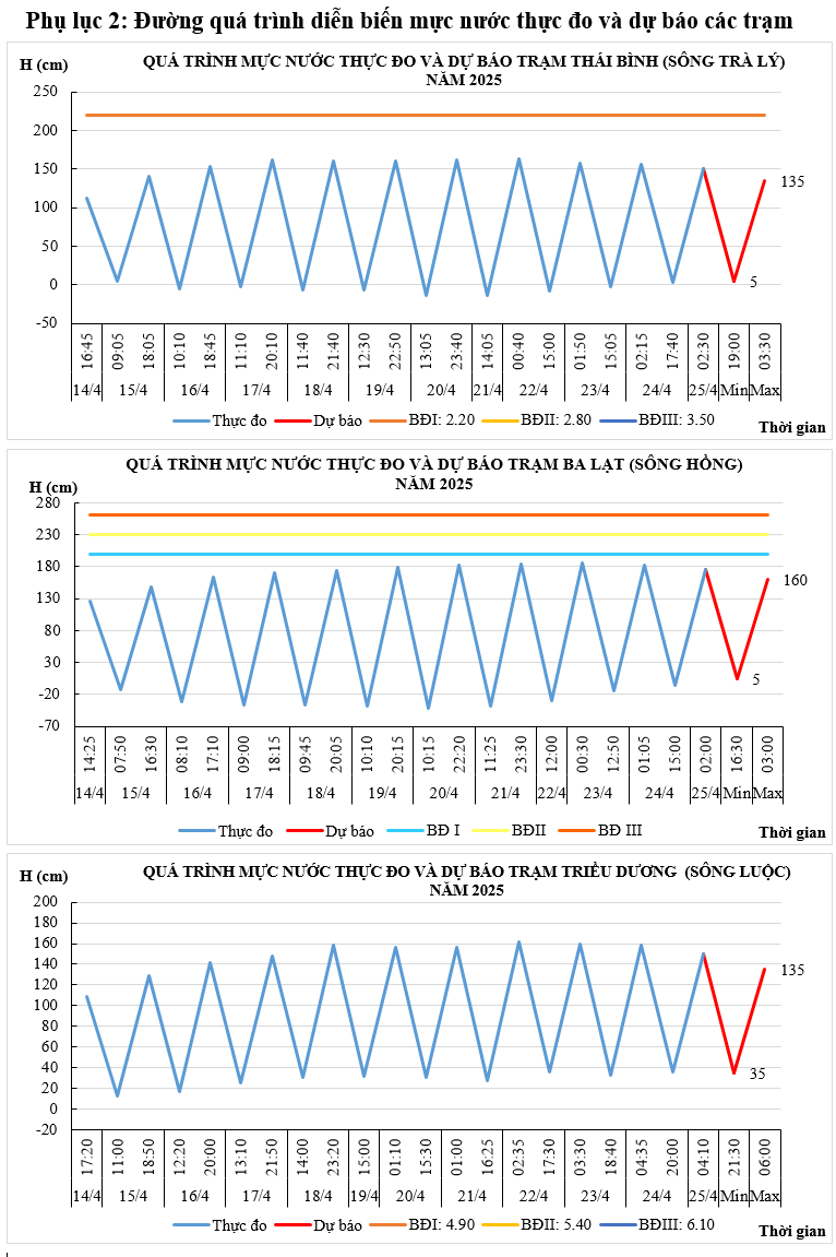 - Mực nước trên các sông Trà Lý, sông Hồng, sông Luộc chịu ảnh hưởng của thủy triều, điều tiết hồ thủy điện: Xu thế xuống.