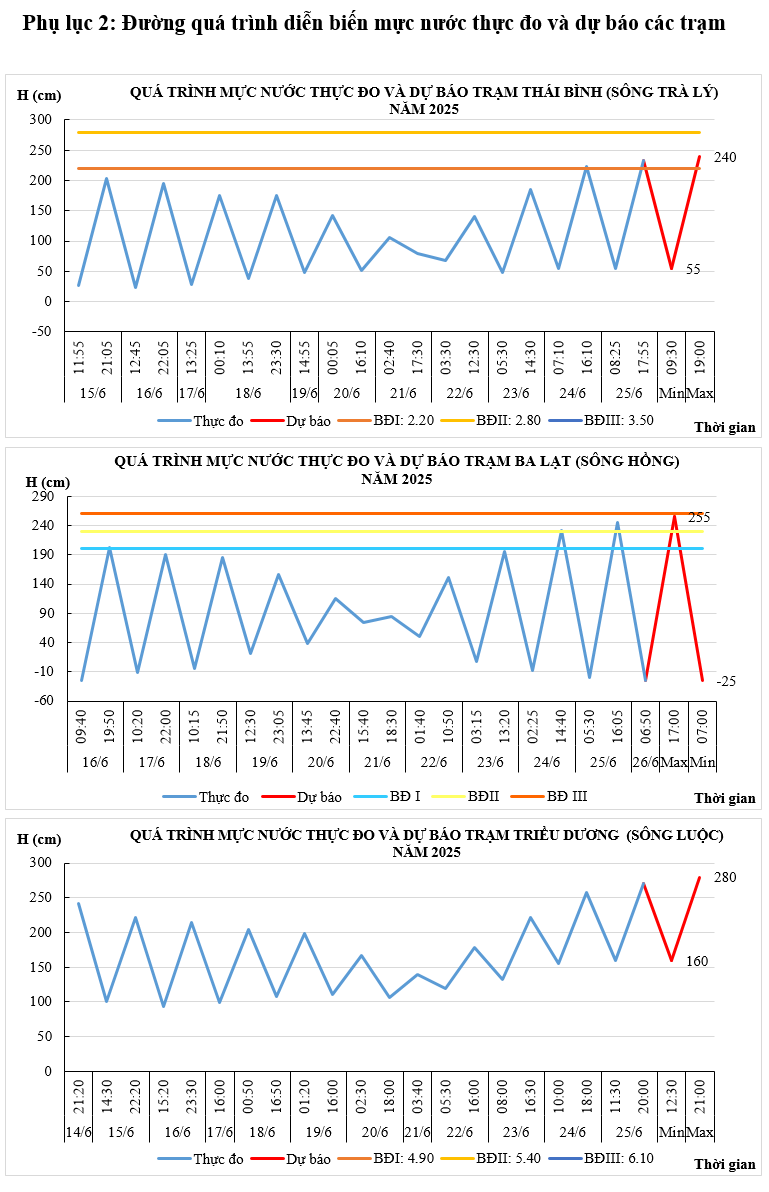 - Khả năng xuất hiện các hiện tượng thủy văn nguy hiểm trong thời hạn dự báo: Ngày 26/6 mực nước đỉnh triều trạm Thái Bình, Đông Quý, Ba Lạt có khả năng đạt trên báo động I-II.