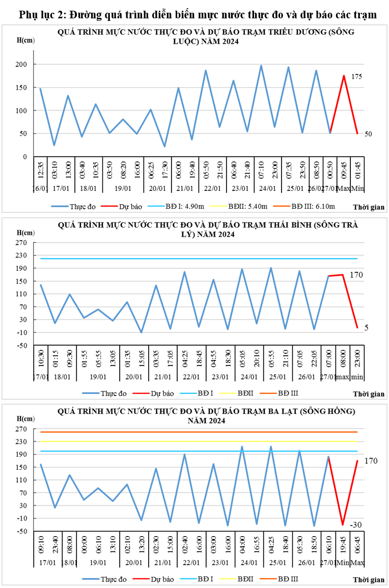 - Mực nước trên các sông Trà Lý, sông Hồng, sông Luộc tiếp tục chịu ảnh hưởng của thủy triều, điều tiết hồ thủy điện xả nước đổ ải đợt 1: xu thế xuống.