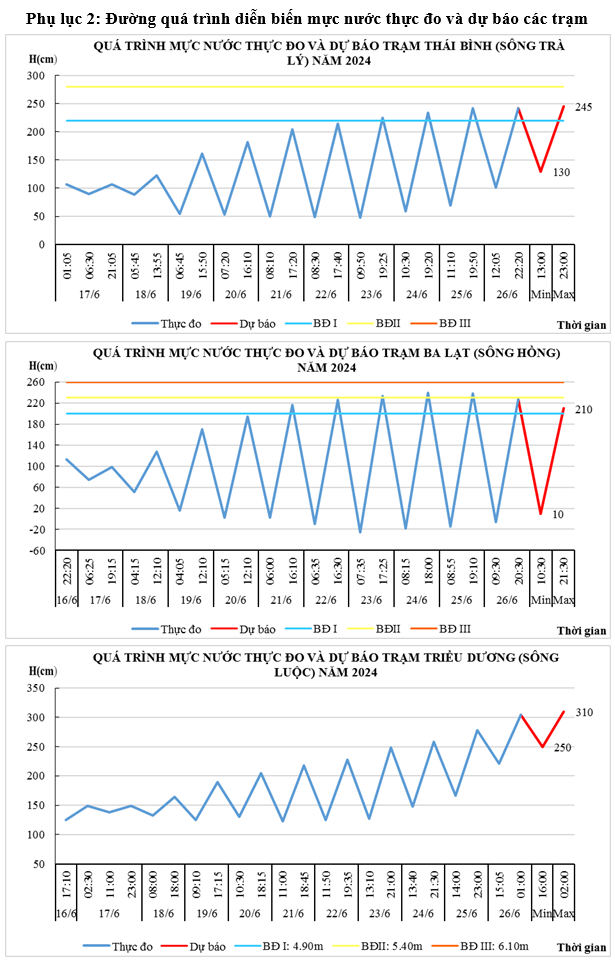 Mực nước trên các sông Trà Lý, sông Hồng, sông Luộc chịu ảnh hưởng của thủy triều, điều tiết hồ thuỷ điện (Hồ Hòa Bình duy trì 1 cửa xả đáy) và mưa lũ thượng nguồn. Mực nước các trạm Tiến Đức, Triều Dương, Quyết Chiến, Thái Bình lên; các trạm Đông Quý, Ba Lạt xuống chậm.
