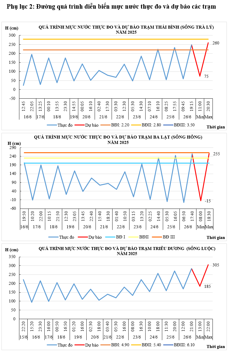 - Khả năng xuất hiện các hiện tượng thủy văn nguy hiểm trong thời hạn dự báo: Ngày 27/6 mực nước cao nhất trạm Quyết Chiến, Thái Bình, Đông Quý, Ba Lạt có khả năng đạt trên báo động I-II.
