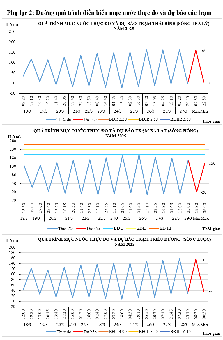 - Mực nước trên các sông Trà Lý, sông Hồng, sông Luộc chịu ảnh hưởng của thủy triều, điều tiết hồ thủy điện: xu thế xuống.