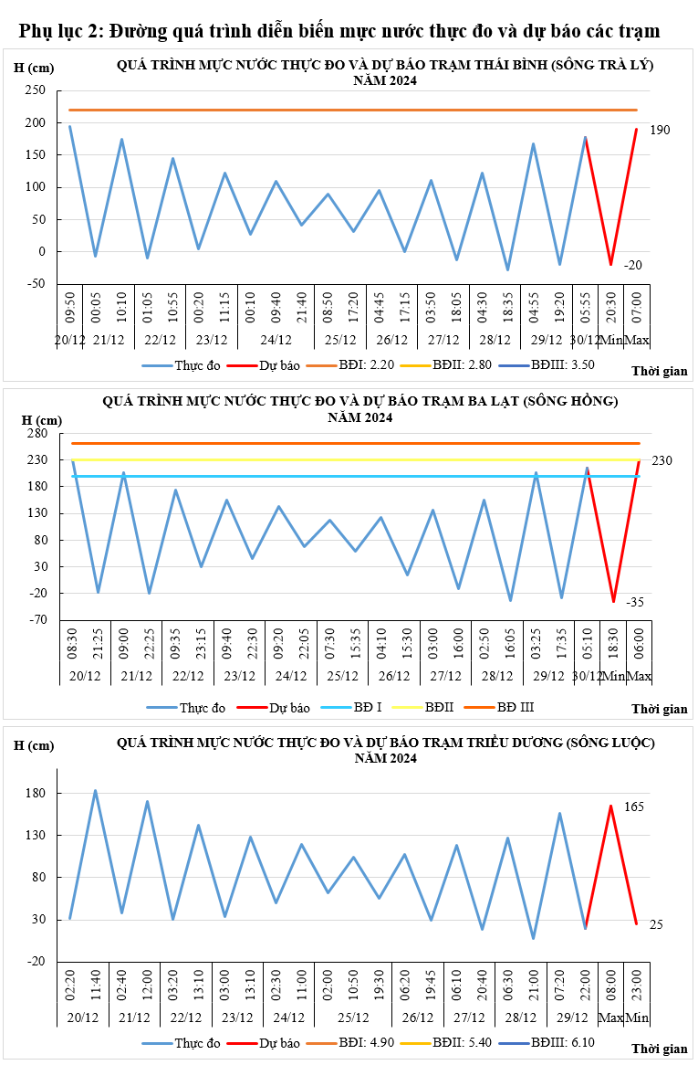 - Khả năng xuất hiện các hiện tượng thủy văn nguy hiểm trong thời hạn dự báo: Ngày 31/12, mực nước đỉnh triều trạm Ba Lạt có khả năng ở mức báo động II.