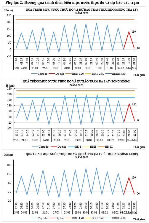 - Mực nước trên các sông Trà Lý, sông Hồng, sông Luộc chịu ảnh hưởng của thủy triều, điều tiết hồ thủy điện: xu thế xuống.