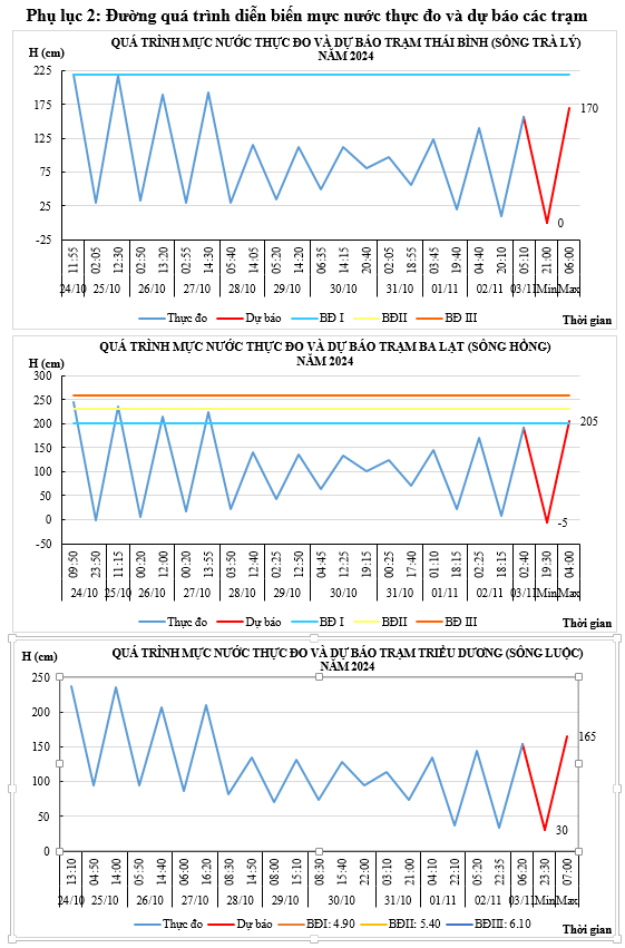 - Mực nước trên các sông Trà Lý, sông Hồng, sông Luộc chịu ảnh hưởng của thủy triều, điều tiết hồ thủy điện: xu thế lên.