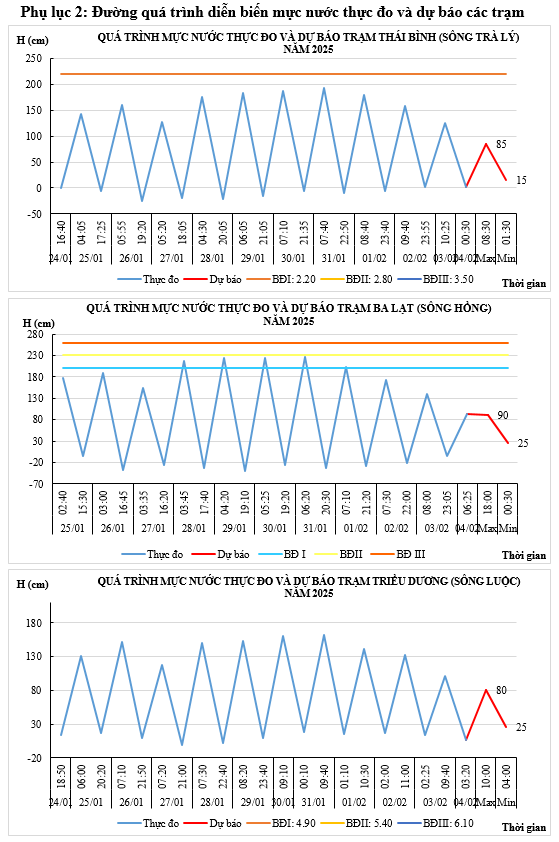- Mực nước trên các sông Trà Lý, sông Hồng, sông Luộc chịu ảnh hưởng của thủy triều, điều tiết hồ thủy điện: xu thế xuống.
