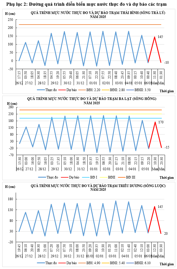 - Mực nước trên các sông Trà Lý, sông Hồng, sông Luộc chịu ảnh hưởng của thủy triều, điều tiết hồ thủy điện: xu thế xuống.