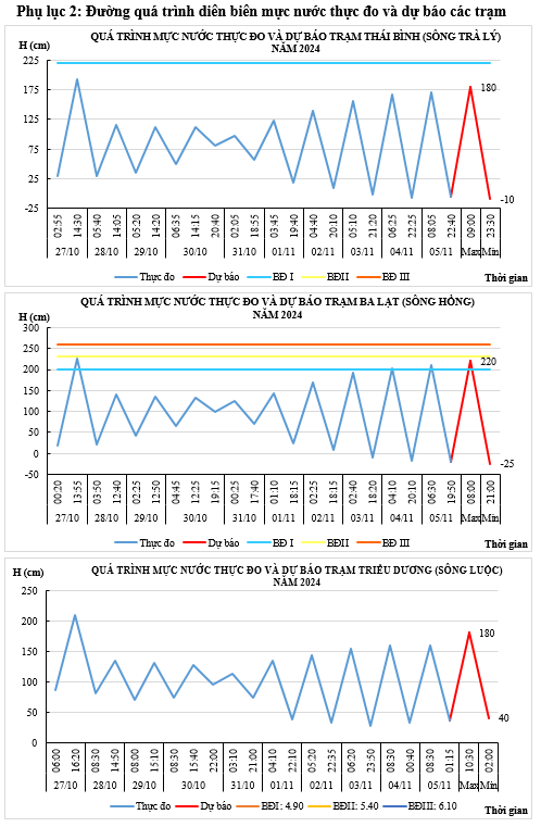 - Mực nước trên các sông Trà Lý, sông Hồng, sông Luộc chịu ảnh hưởng của thủy triều, điều tiết hồ thủy điện: xu thế lên chậm.